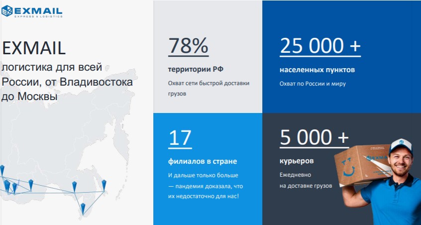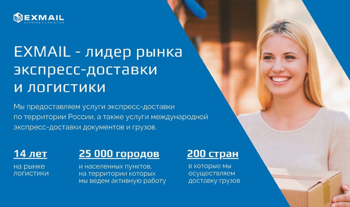 EXMAIL — крупная логистическая компания курьерской экспресс-доставки с широкой сетью филиалов по всей России и странам СНГ с 2008 года.